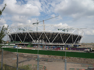 The stadium. In the foreground are some brightly coloured hoardings with commands directed at site-workers on them: "Be Aware!" "Be considerate!" "Be responsible!" Construction workers are always harangued like this, but it's a distinctly authoritarian touch in the Olympic typeface and the New Labour fluorescent palette. DCMS meets DPRK.
